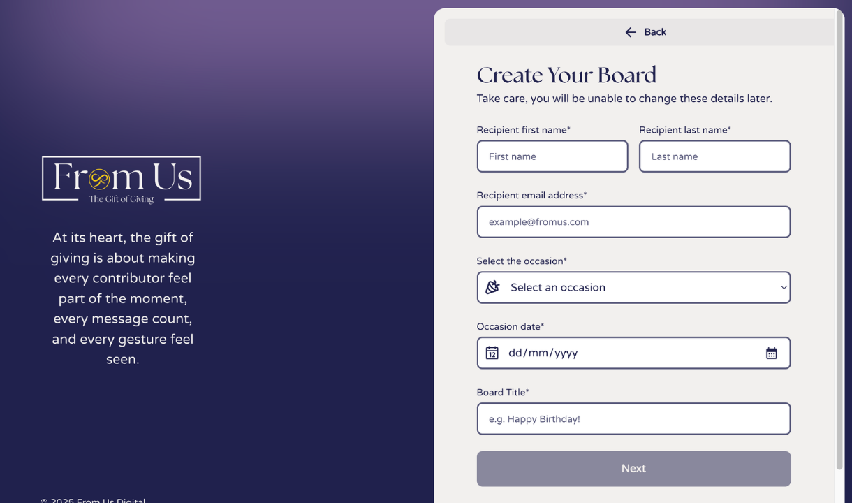 Start by adding recipient and occasion details, clicking through two steps to create the board. This takes you to personalising your board with the option to add your own background image, choosing a layout, and posting your message.
